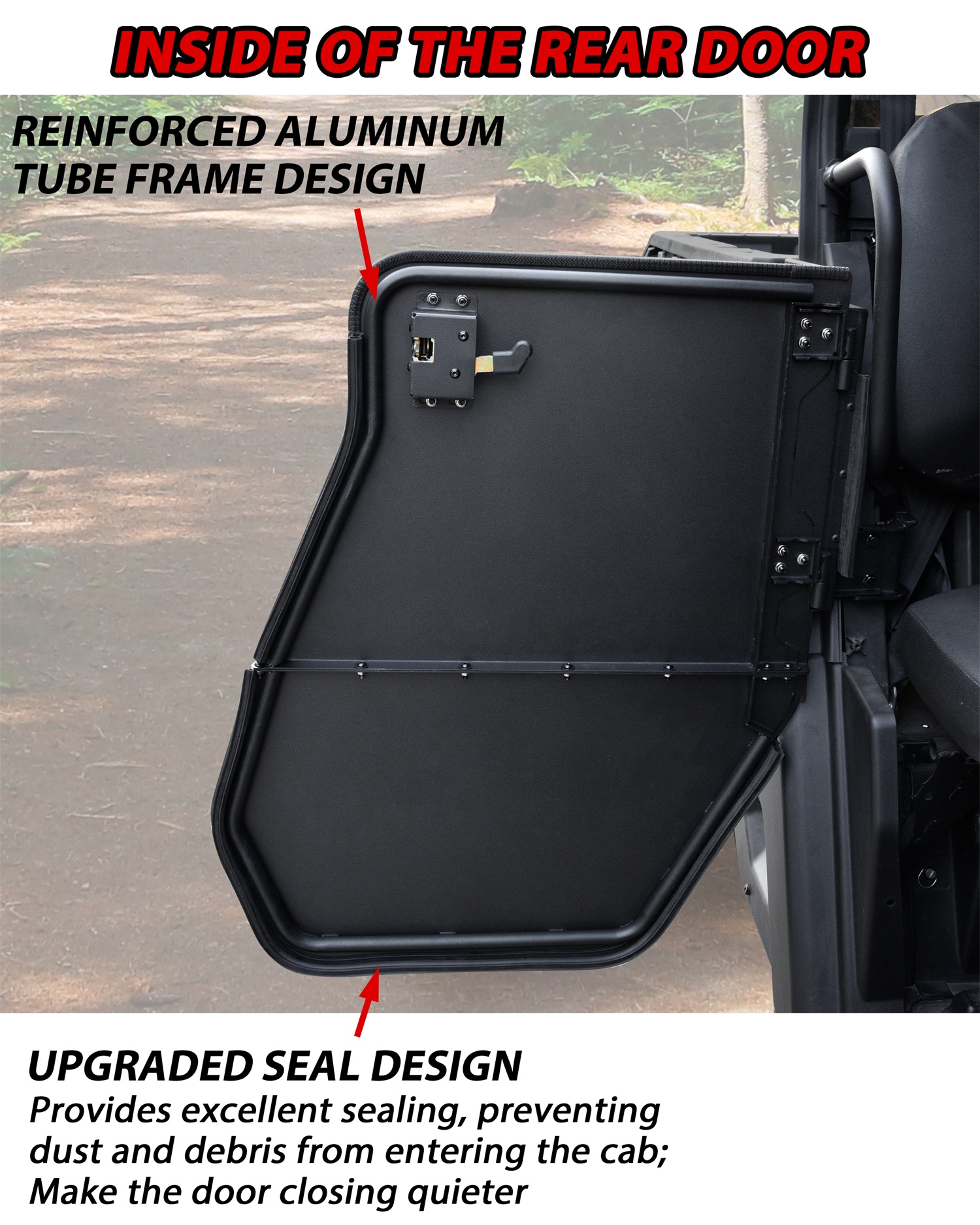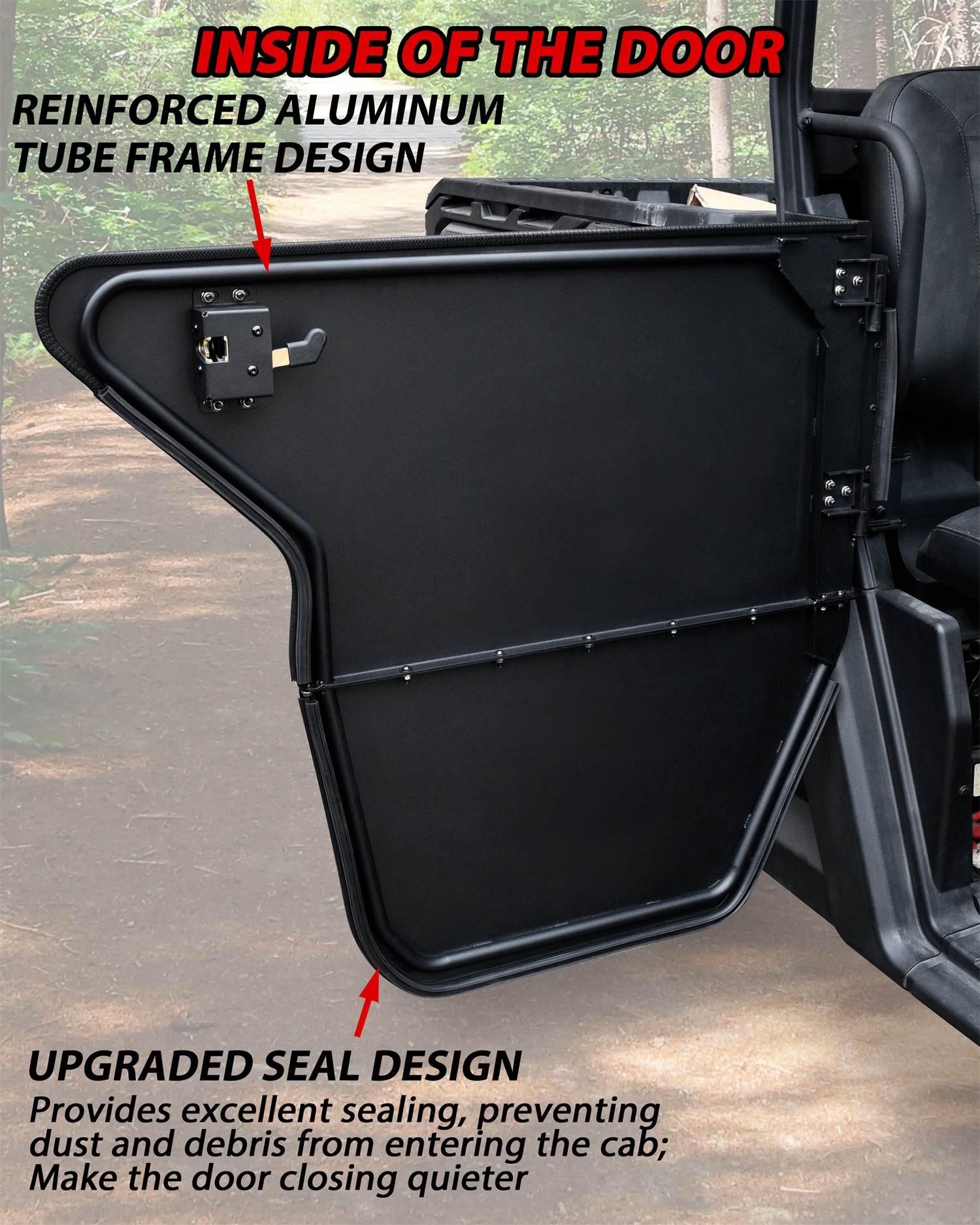 - Easy to install, no cutting or bending; Package include: One pair of aluminum rear half doors (Driver & Passenger Seat) with install hardware and installation manual(Please refer to the installation video before your installation)