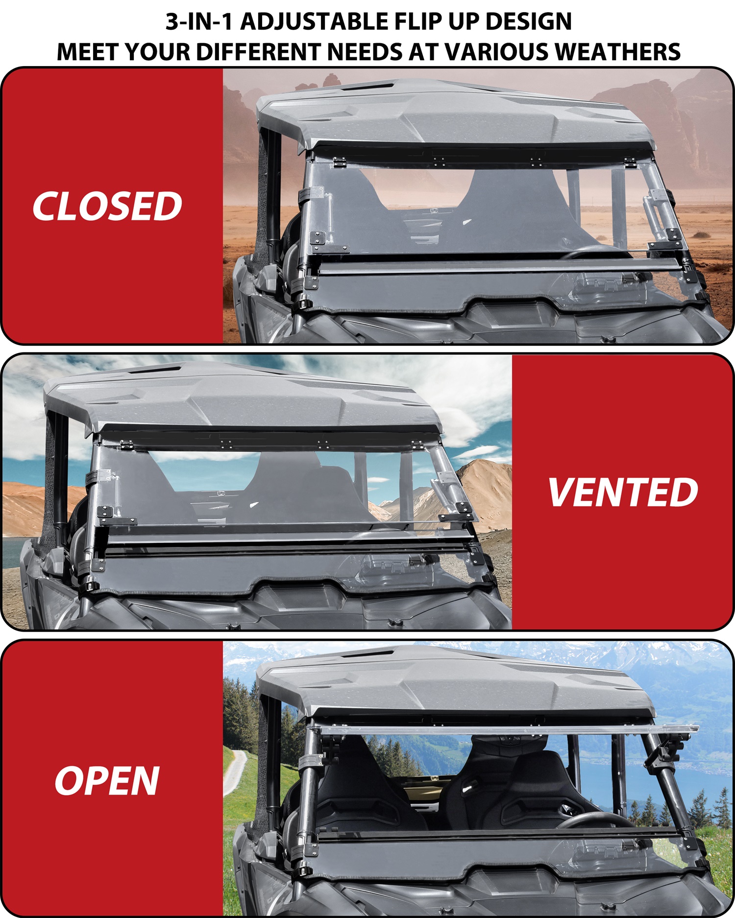 - 3-in-1 Windshield: When you feel hot or cold, or just want to enjoy the wind or get protection, you can turn the windshield open, closed, or venting; It delivers comprehensive protection with weatherproof seals that block dust, rain, and snow, perfectly matching various weather conditions, ensuring comfort and allowing you to enjoy the flexibility of riding