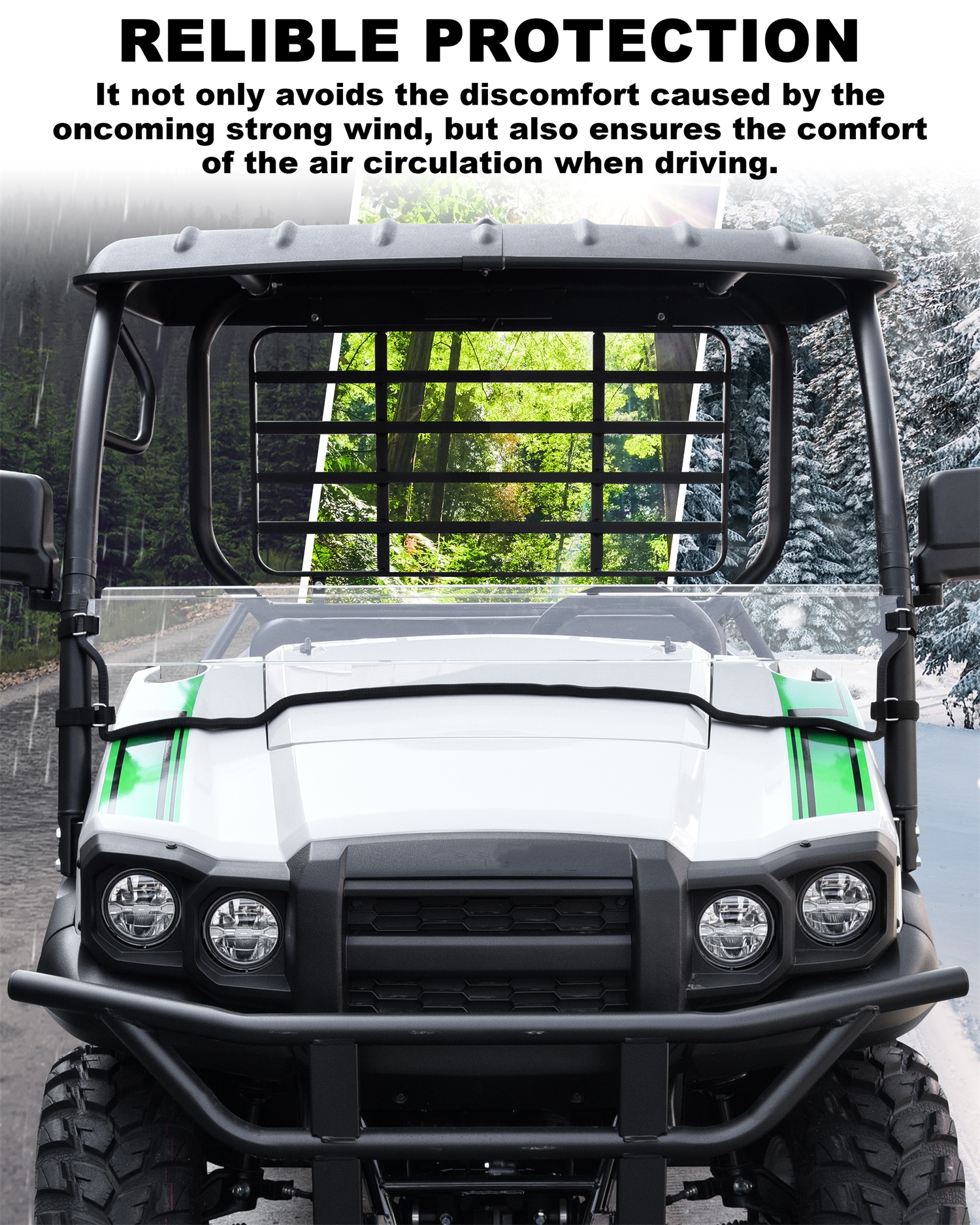- All-Weather Protection & Comfort: Prevents wind, leaves, and debris from flying directly into the cab, keeps the interior of the UTV dry and tidy. Besides, the windshield keeps you warm in winter, and prevents dust and rain in summer
