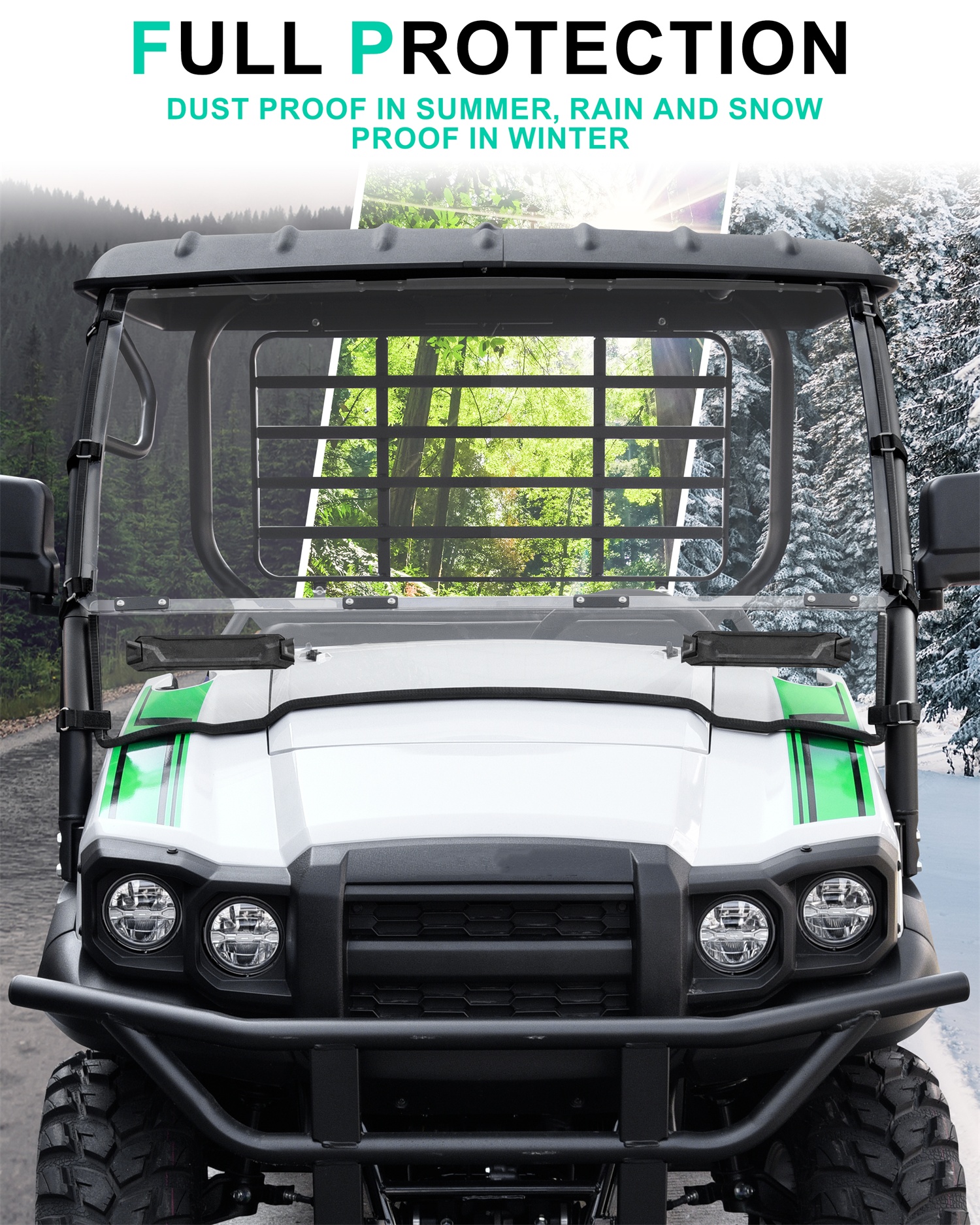 - All-Weather Protection & Comfort: Prevents wind, leaves, and debris from flying directly into the cab, keeps the interior of the UTV dry and tidy. Besides, the windshield keeps you warm in winter, and prevents dust and rain in summer