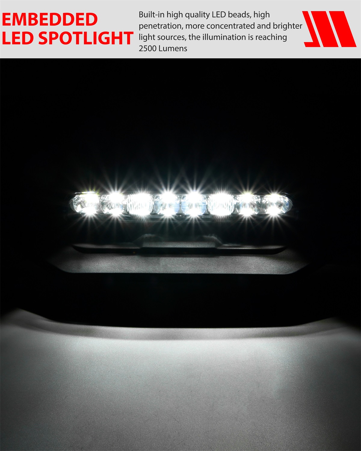 - Embedded LED Spotlight-This Turbo hood kit has a embedded LED spotlight, built-in high quality LED beads, high penetration, more concentrated and brighter light sources, the illumination is reaching 2500 Lumens, advanced air duct design, grooved heat sink, fast heat dissipation, working in all weather conditions