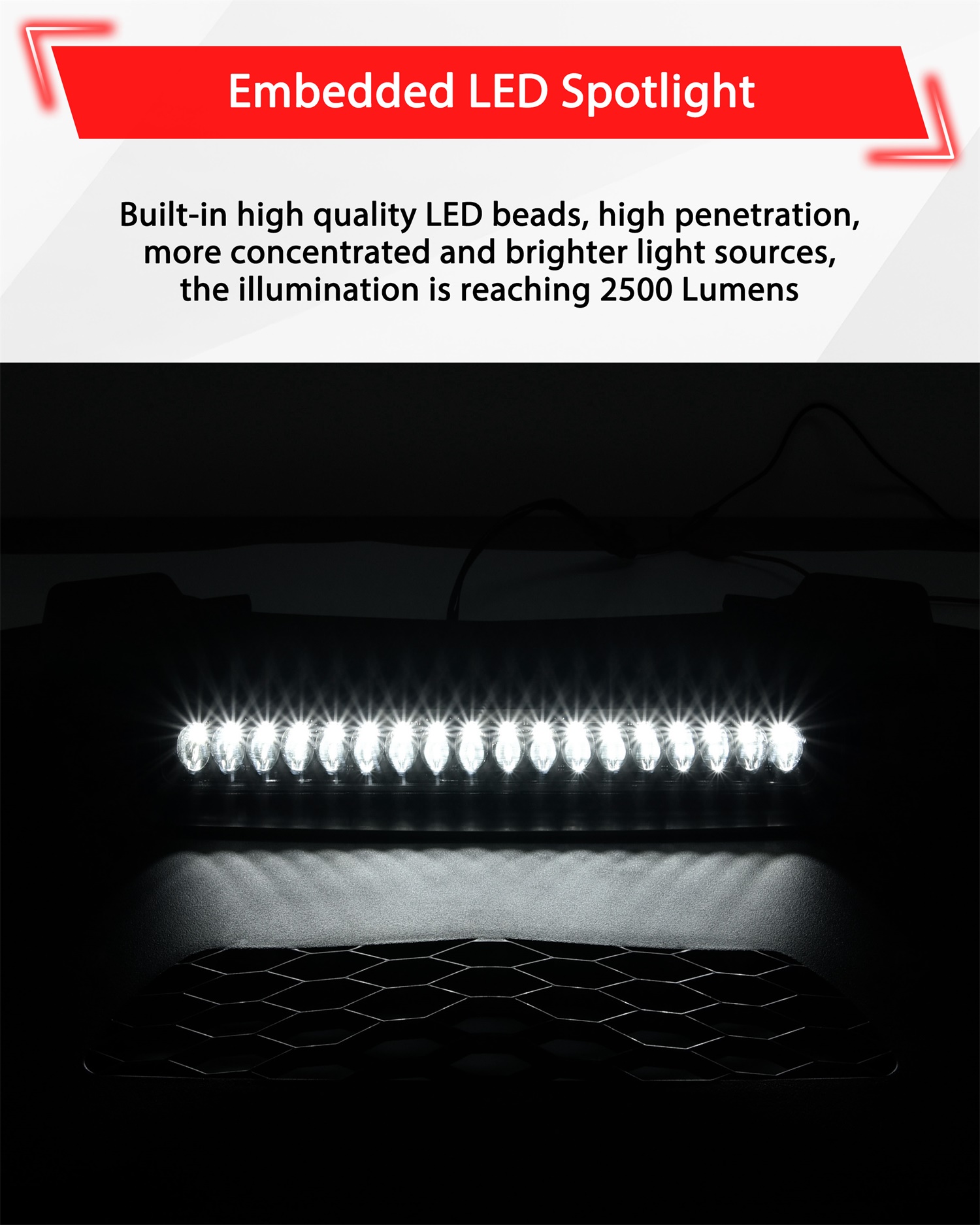 - Embedded LED Spotlight: This Turbo hood kit has a embedded LED spotlight, built-in high quality LED beads, high penetration, more concentrated and brighter light sources, the illumination is reaching 2500 Lumens, advanced air duct design, grooved heat sink, fast heat dissipation, working in all weather conditions