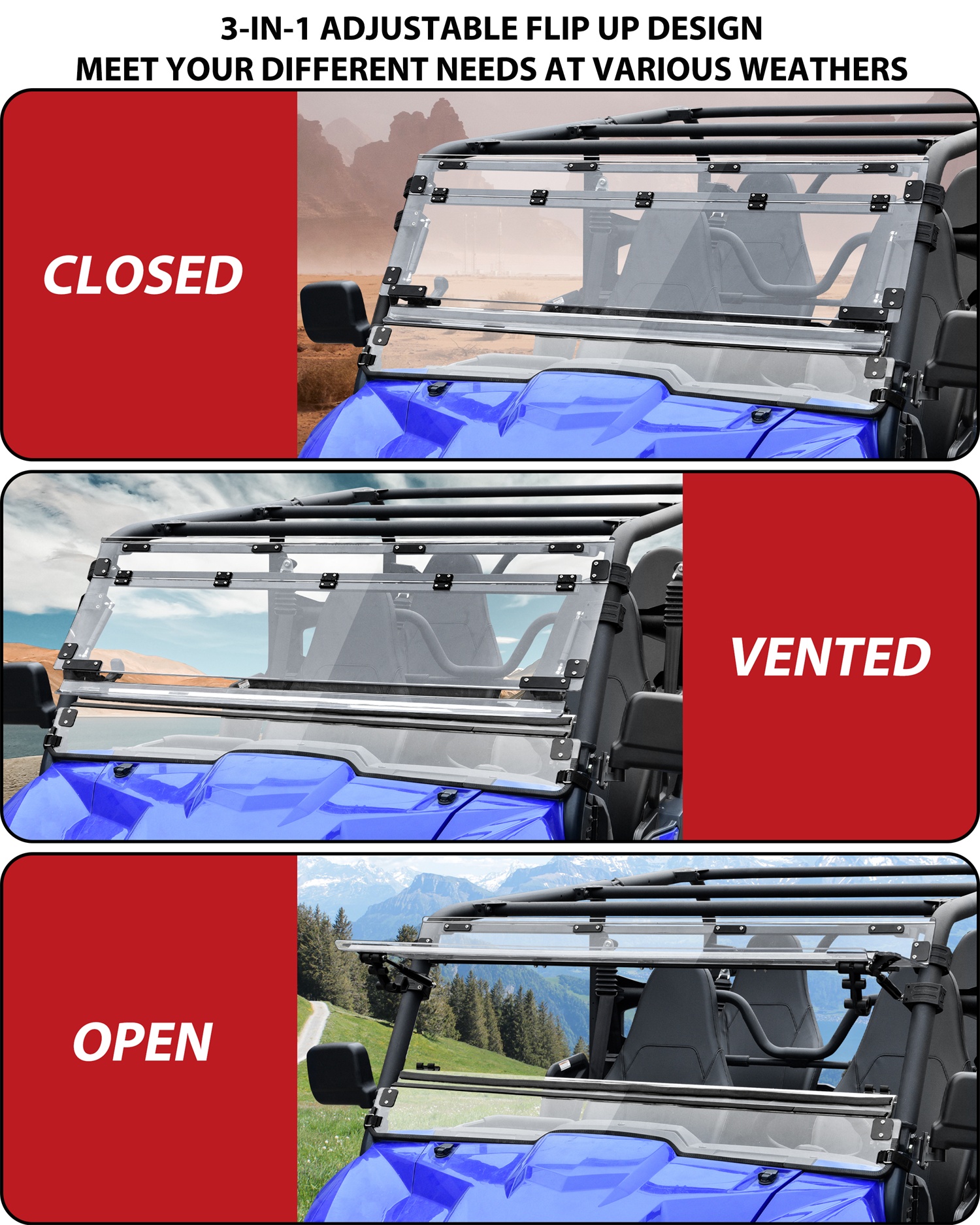 - 3-in-1 Windshield: When you feel hot or cold, or just want to enjoy the wind or get protection, you can turn the windshield open, closed, or venting; It delivers comprehensive protection with weatherproof seals that block dust, rain, and snow, perfectly matching various weather conditions, ensuring comfort and allowing you to enjoy the flexibility of riding