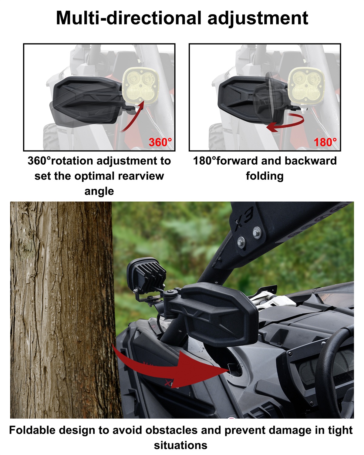 - OPTIMIZED VISIBILITY: Wider mirror and convex surface, gives you a wider view of the trail, helps you stay aware of surroundings on the trails; Multi-directional adjustment, 360° rotation adjustment to set the optimal rearview angle,and 180° forward and backward folding, foldable to avoid obstacles and prevent damage in tight spaces; Built-in high quality LED beads of the pod lights, low power consumption; The bright LED pods enhance nighttime driving safety, ensuring clear vision on dark trails or rural roads; Improves visibility in low-light conditions, reducing eye strain during long drives