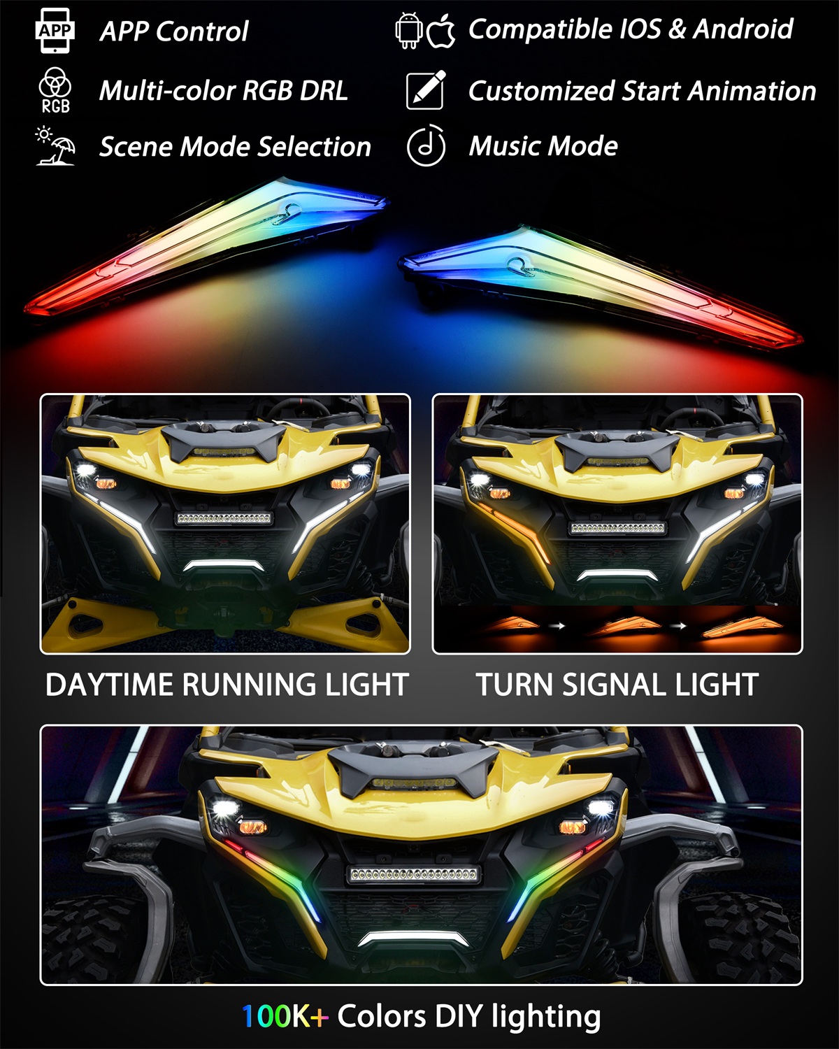- [LIGHTS CHANGE WITH MUSIC, SCENE] – This RGB daytime running light can synchronize with the rhythm of your favorite songs to beat and flash, through the voice pickup mode, the light will beat with the rhythm of the song in real time, the difference is that our product can also switch different animation effects in music synchronization mode to match any mood or scene, providing unlimited vitality for your driving; there are a variety of scene modes to choose from. Intelligent adaptation to various occasions of use, such as parties, emergencies, travel, etc., bringing unlimited convenience to your life