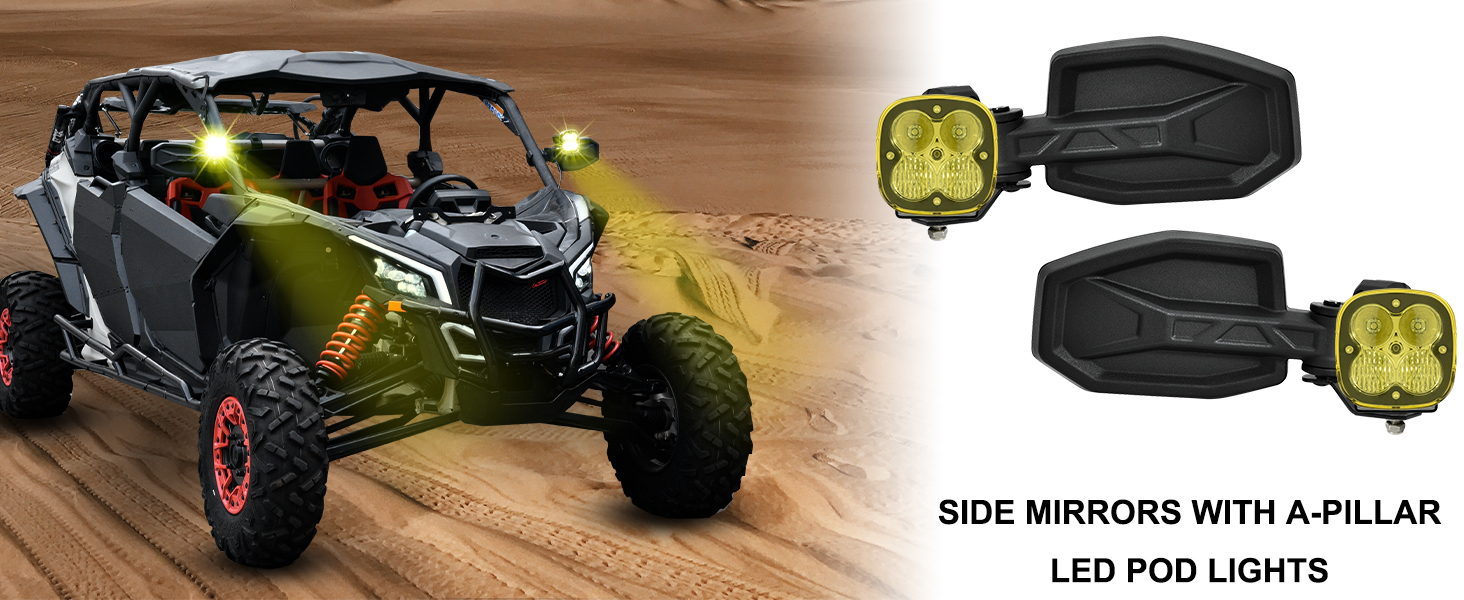 Aluminum Side Mirrors with A-Pillar LED Pod Lights for Can-Am Maverick X3 XDS XRS MAX Turbo RR 2017-2026