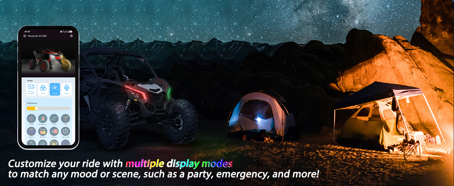 - [LIGHTS CHANGE WITH MUSIC, SCENE] – This RGB daytime running light can synchronize with the rhythm of your favorite songs to beat and flash, through the voice pickup mode, the light will beat with the rhythm of the song in real time, the difference is that our product can also switch different animation effects in music synchronization mode to match any mood or scene, providing unlimited vitality for your driving; there are a variety of scene modes to choose from. Intelligent adaptation to various occasions of use, such as parties, emergencies, travel, etc., bringing unlimited convenience to your life